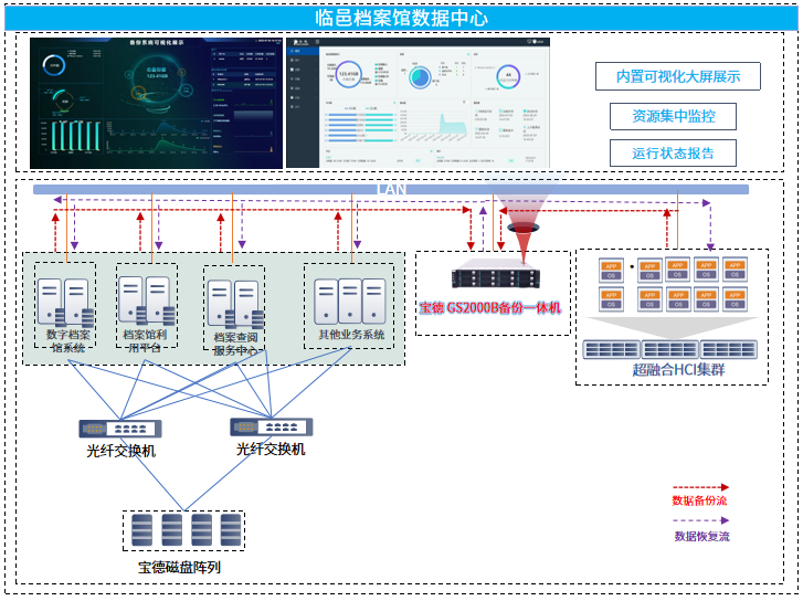 针对临邑档案馆的迫切需求,suncitygroup太阳新城凭借雄厚的技术实力和丰富的行业经验,深入调研,精准把脉,打造了一套基于GS2000B备份系统的数据保护解决方案。该方案备高效、灵活、可扩展等优势,可完美融入档案馆的数据中心机房,通过万兆网络接入核心交换机,在MySQL数据库服务器、应用服务器等关键设备上安装备份客户端,实现了对数据库、文件等关键数据的定时备份与恢复,构建了一个全方位、多层次的数据安全保护体系,为档案馆的数据安全筑起了铜墙铁壁。