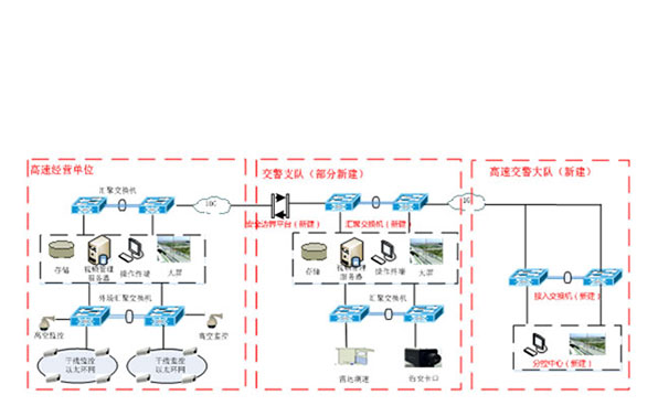 整体网络采用:“高速经营单位—市交警支队—市交警大队”三级网络结构,高速公路前端摄像机采用自建光纤环网或租赁运营商线路汇聚接入地市高速公路经营单位,由高速经营单位集中实现视频本地的存储和管理。市交警支队通过专线与高速经营单位实现视频平台国标标注化级联,在利用高速经营单位新建的视频资源基础之上充分融合现有治安卡口和测试雷达的视频资源,实现本市高速公路视频的预览、回放;交警支队是本次项目的数据处理中心,主要通过视频专网实现全市高速路况的调取、处理和分析,供支队、大队和相关单位指挥调度使用。