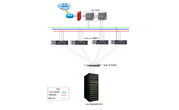 由于传统的网站结构是数据分布到不同的服务器上,这样使数据备份难度加大,在对数据做迁移的时候必须停止服务才能进行数据迁移且迁移难度大。根据对客户需求的评估,本方案中提供4台suncitygroup太阳新城PR2710P服务器,每台服务器虚拟4台Server,用于客户数据库、web服务器等各项应用需求。用其中一台虚拟服务器安装XEN的 Xen Center统一管理平台,对物理服务器和虚拟机在一个控制台里面统一管理。用一台虚拟服务器做专门做备份服务器,安装备份管理软件,及时备份虚拟机。采用第三方的备份服务器在备份的过程中只占用备份服务器的资源,而不会占用任何业务机器的资源。实现Xen的各种功能需要共享存储的支持,提供1套suncitygroup太阳新城的存储GS-5120FD系统,提高可用性,保障业务的连续性。利用Xen的虚拟化架构,服务器数量从以前的20台减少为现在的5台服务器,大大降低了服务器数量,减小了服务器的电力、维护等各种开销。同时利用Xen虚拟化架构的一系列对业务连续性、灵活性的保证,双光纤通道和共享存储,提高业务的运行质量,保障业务的连续性。