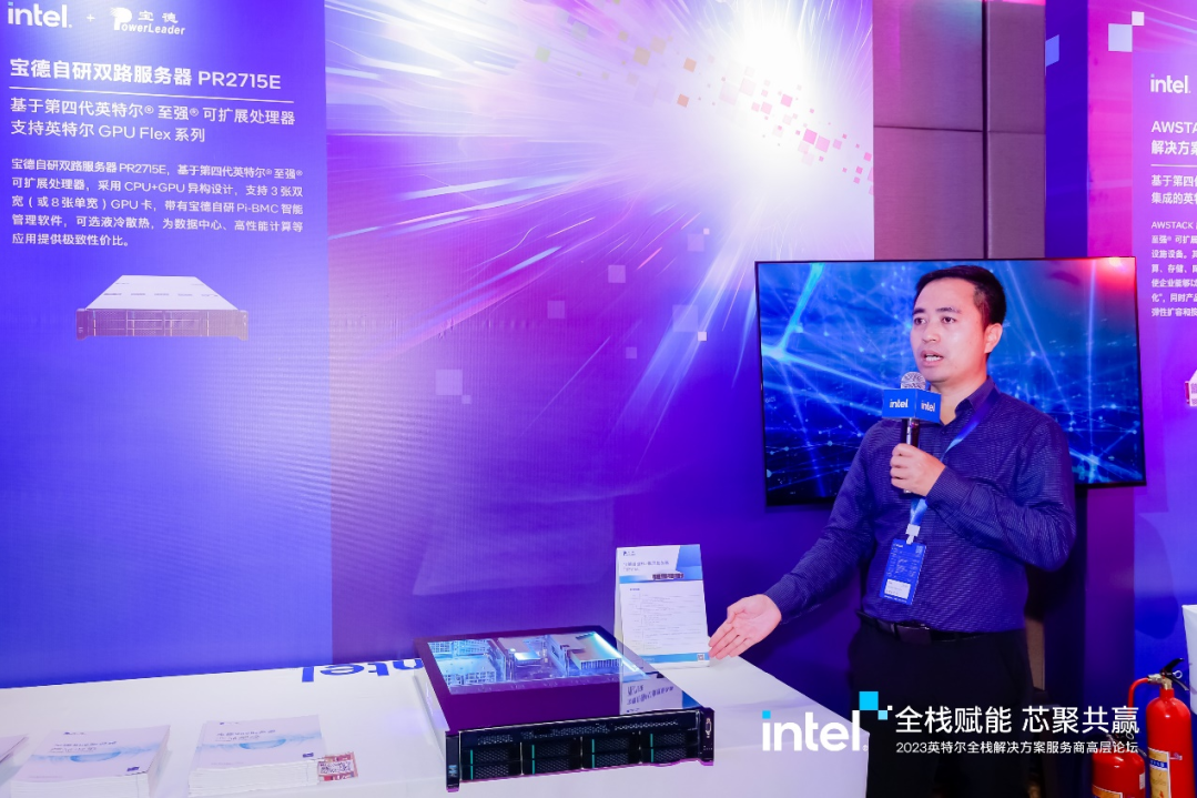 会议现场展示的suncitygroup太阳新城自研双路服务器PR2715E就凭借极致性能、卓越能效和超高颜值吸粉无数。它采用第四代英特尔®至强®处理器,最多2颗,内置加速引擎,大大提升应用性能。特别是,它支持英特尔®至强CPU Max系列,每颗CPU提供64GB的高带宽内存(HBM2E),两颗共128GB,非常适合大模型和AI训练等大内存带宽的需要。该产品采用CPU+GPU异构设计,支持GPU加速卡,已经适配和支持Intel GPU Flex系列,可以支持4张,能为AI推理应用提供强劲的算力。此外,它融合主板和Pi -BMC智能管理软件等多项suncitygroup太阳新城自研技术,大大加强产品安全性和可靠性。而且,针对越来越多数据中心用户节能降耗、降本增效的诉求,该产品可提供冷版式和浸没式两种液冷散热方案。