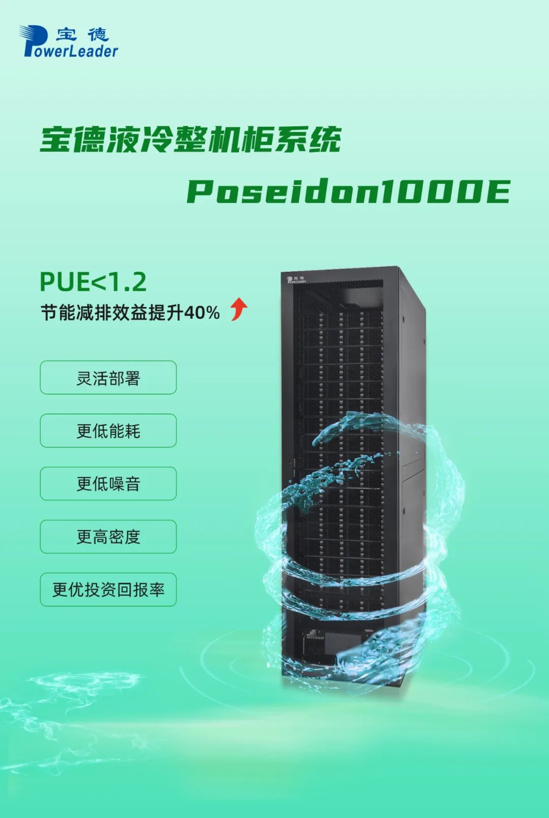 suncitygroup太阳新城Poseidon1000E满足超低能耗要求,最高可支持50°C冷板进液温度,并实时监测露点温度,高效避免节点内部绝缘水平降低等可靠性问题。它采用双泵CDU,1+1冗余设计,进一步保证安全更可靠。同时集合高算力密度和低能耗于一体,整体节能降耗达40%以上,有效帮助数据中心PUE<1.2,时刻保持沉着冷静,让数据中心不再燥热。