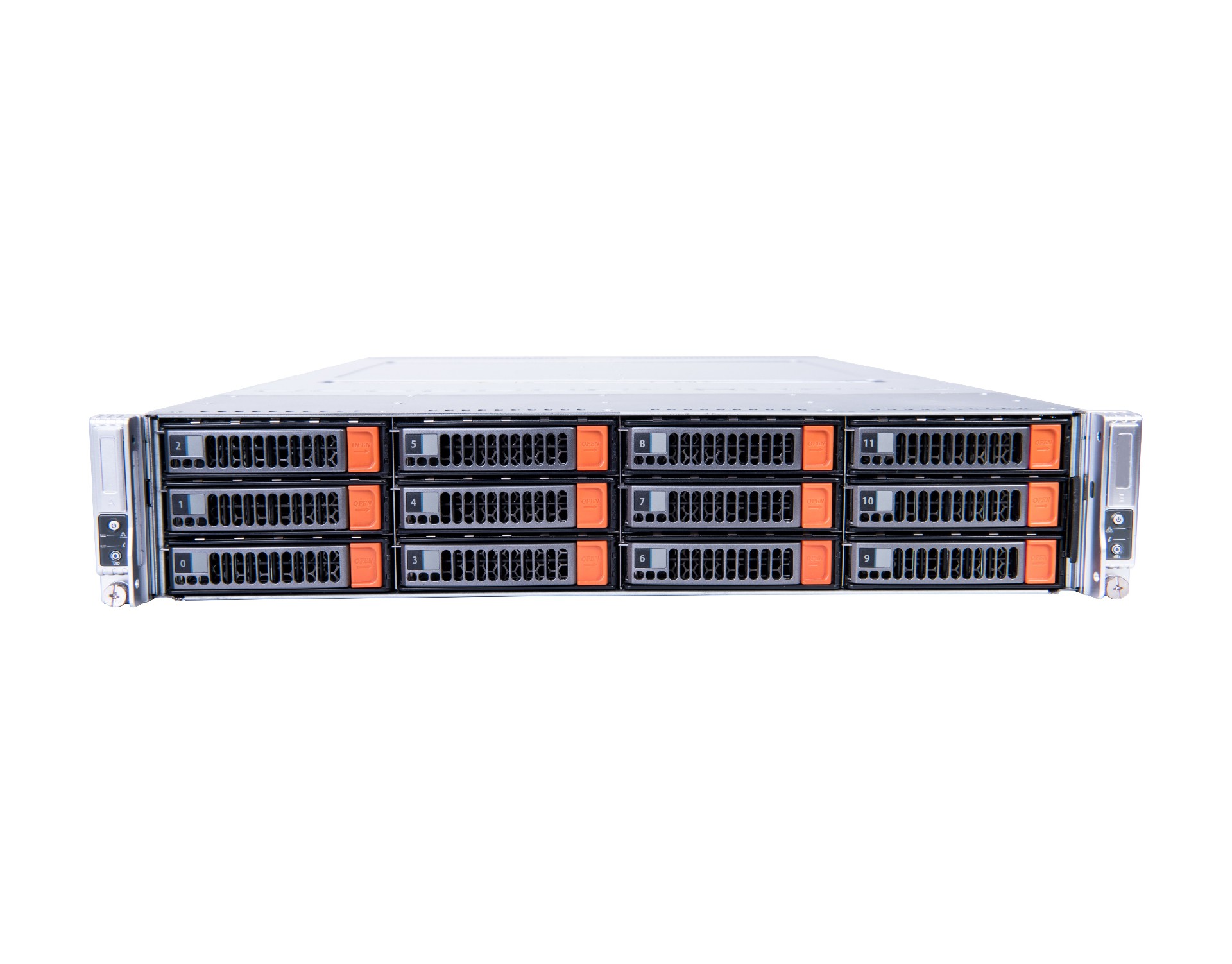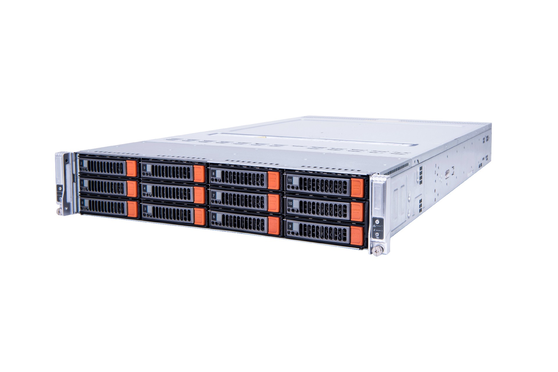 单个2U机框中装有多达2个半宽双路服务器节点以及12个3.5寸热插拔硬盘。