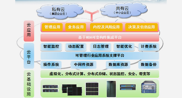 中国金融企业发展所面临的环境以及中国金融业信息化发展的需求,主要表现在以下几点:竞争加剧,客户关系管理及以客户为核心的新一代核心业务体系需要不断升级,以形成能够粘着客户的运营体系;商务智能以及相应的决策管理系统的建设为提高客户服务水平与业务创新提供重要支撑;随着数据集中的进一步进行,电子银行等新业务渠道的开拓,灾难备份与信息安全体系建设需要进一步深入进行;从分业经营到混业经营的过渡将对金融信息化提出更多的要求;IT外包是国外金融业成功的经验,国内金融行业未来竞争过程中仍需要适度进行IT外包;根据CMP咨询对金融机具市场的研究,围绕信息化应用与业务创新的金融机具升级与应用仍将是未来几年中的发展方向之一。 在云计算技术框架下,通过构建金融行业私有云平台,实现各级金融机构及监管机构的信息共享,通过浏览器连接到云端,快速获取综合数据库以及各部门之间的信息。云计算快速的计算能力和更大的储存空间能够更加快速的更新数据,更加全面地记录信用信息,同时金融行业海量的数据及数据中心能够进行集中的管理和维护,从而极大减少后期信息化维护成本,易于管理,将对未来金融体系的建设和发展有着极大的推动作用。