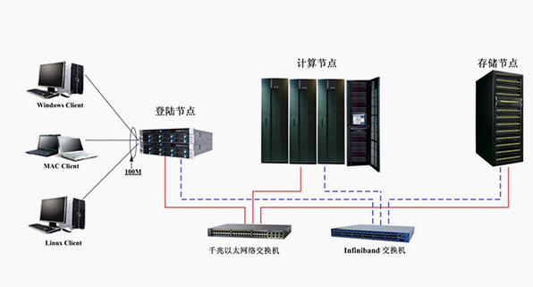 整个系统浮点计算理论峰值可以达到7.6万亿次以上 ;计算模块间采用56Gbps 高速Infiniband互联,端到端延迟小于1.2us,优于市场上的所有的商品化高速互联网络。